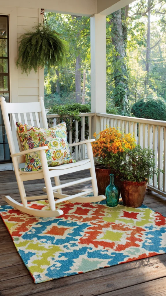 Choose rugs in sizes extending beyond rocker footprints creating adequate borders, select patterns and colors coordinating with cushions and home exteriors, and ensure flat-weave construction suitable for outdoor exposure and easy cleaning. The rug foundation makes rocker placements feel intentional and designed rather than simply positioned on available porch space. Layer multiple rockers, side tables, and accessories on single rugs creating complete outdoor seating vignettes.
