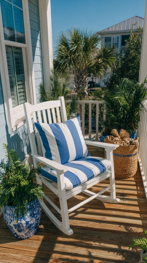 Paint rockers in white or soft blue providing coastal color foundations, add striped or solid blue cushions reinforcing the maritime palette, and accessorize with rope-wrapped elements, nautical lanterns, or beach-themed decorative objects. The coastal theme feels perpetually summery and relaxed while the classic color combination never appears dated or overly trendy.