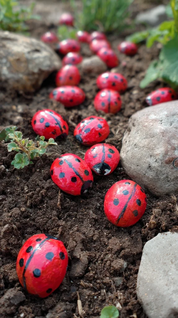 Transform smooth oval stones into cheerful ladybugs through red bodies with black spots creating classic beloved garden insects that add whimsical touches to flower beds and container plantings. Paint stones bright red, add black semicircle at one end representing the head, paint contrasting black spots across bodies in random organic patterns, and add tiny white highlight dots to spots creating dimensional effects.