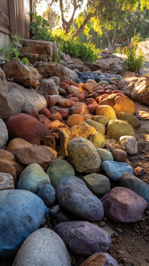 The subtle approach suits formal or naturalistic gardens where bold painted designs might feel inappropriate while the enhanced stones add polished refinement. The technique celebrates rocks’ inherent beauty while elevating them through artistic enhancement.