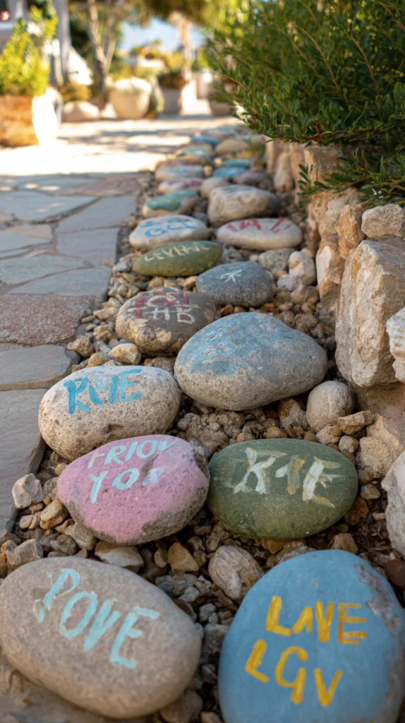 Paint motivational words, garden quotes, or meaningful phrases onto smooth flat rocks creating personalized messages that inspire and delight viewers discovering them throughout landscapes. Choose words like “Grow,” “Bloom,” “Dream,” “Peace,” or longer meaningful quotes, paint in colors coordinating with surrounding plantings, and seal thoroughly protecting painted surfaces from weather exposure.