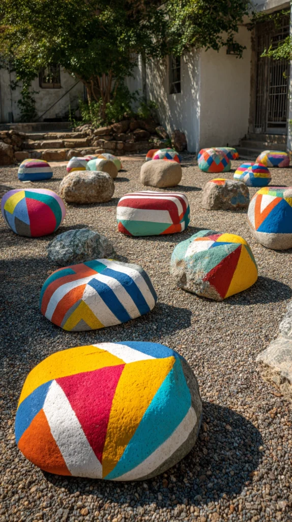 Create contemporary garden art through bold geometric designs including chevrons, triangles, circles, or abstract color-blocked patterns appealing to modern aesthetic sensibilities. Paint rocks in complementary color combinations using painter’s tape creating crisp geometric edges, design patterns inspired by tribal or contemporary art movements, or create ombre effects blending colors smoothly.