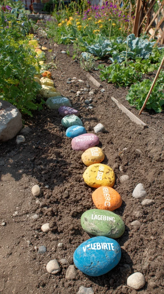 Design functional painted rocks resembling vegetables or labeled with crop names creating attractive permanent garden markers that never fade or deteriorate like traditional wooden stakes. Paint rocks to resemble tomatoes, carrots, peppers, or other vegetables using realistic colors and details, or simply paint vegetable names in clear lettering on appropriately colored backgrounds.
