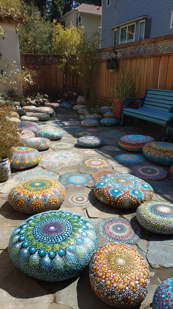 Create intricate mandala designs or dot painting patterns inspired by traditional techniques creating meditative art pieces that add sophisticated detailed interest to garden spaces. Use dotting tools or paint pen tips creating precise dots in radiating symmetrical patterns, choose color palettes ranging from monochromatic sophistication to vibrant rainbow effects, and seal carefully protecting delicate detailed work. The intricate designs reward close examination revealing complexity and care while the repetitive creation process provides meditative creative outlets. Display prominently where detailed work can be appreciated, or create collections in varied sizes and color schemes.