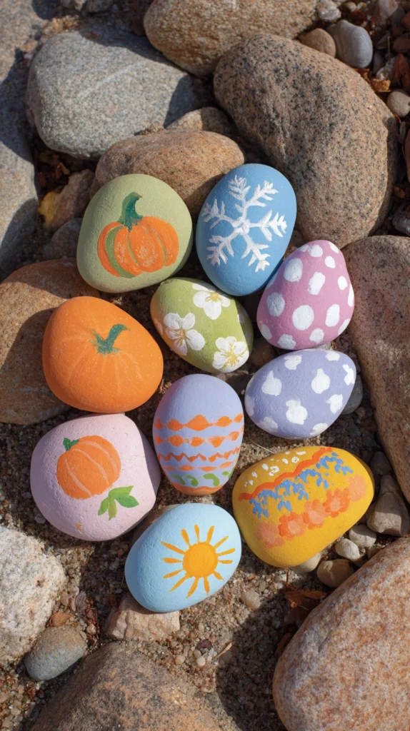Paint rocks with seasonal motifs creating rotating decorative elements that keep gardens feeling current and festive throughout the year without permanent installations. Design pumpkins and autumn leaves for fall, snowmen and evergreen trees for winter, pastel eggs and flowers for spring, and bright sun designs for summer.