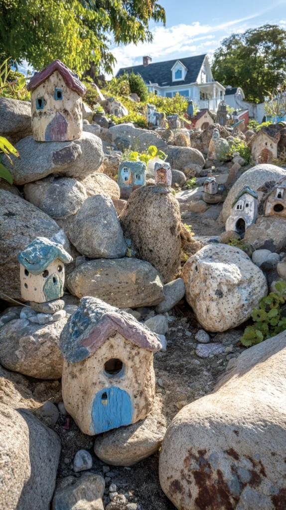 Transform larger rocks into miniature dwellings complete with painted doors, windows, and architectural details creating whimsical fairy garden elements that delight children and adults alike. Paint arched doors in bright colors, add window details with shutters and flower boxes, include painted stone textures or shingled roofs, and perhaps add small real accessories like tiny doormats or miniature plants. Position among plantings creating magical discovered villages, cluster several creating fairy neighborhoods, or feature individually as focal points. The imaginative houses add storytelling elements encouraging creative play and enchanted garden narratives.