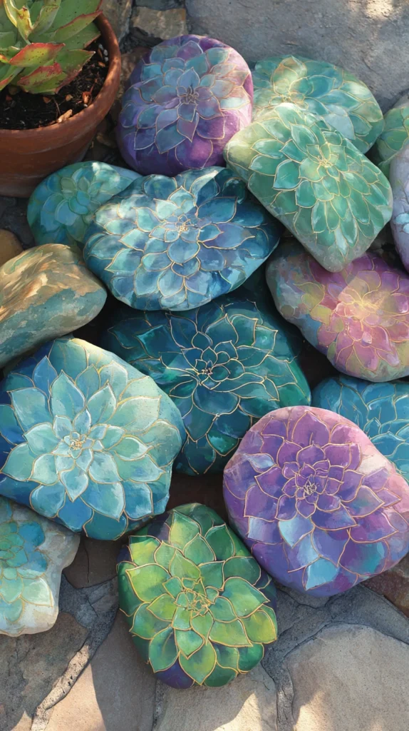 Create permanent low-maintenance “succulent” gardens by painting realistic succulent designs on flat rocks that never require watering or die during harsh weather. Study actual succulents noting their distinctive rosette forms and varied green-blue-purple colorations, paint detailed realistic representations, and arrange painted rocks in shallow containers or directly in gardens mimicking living succulent arrangements.