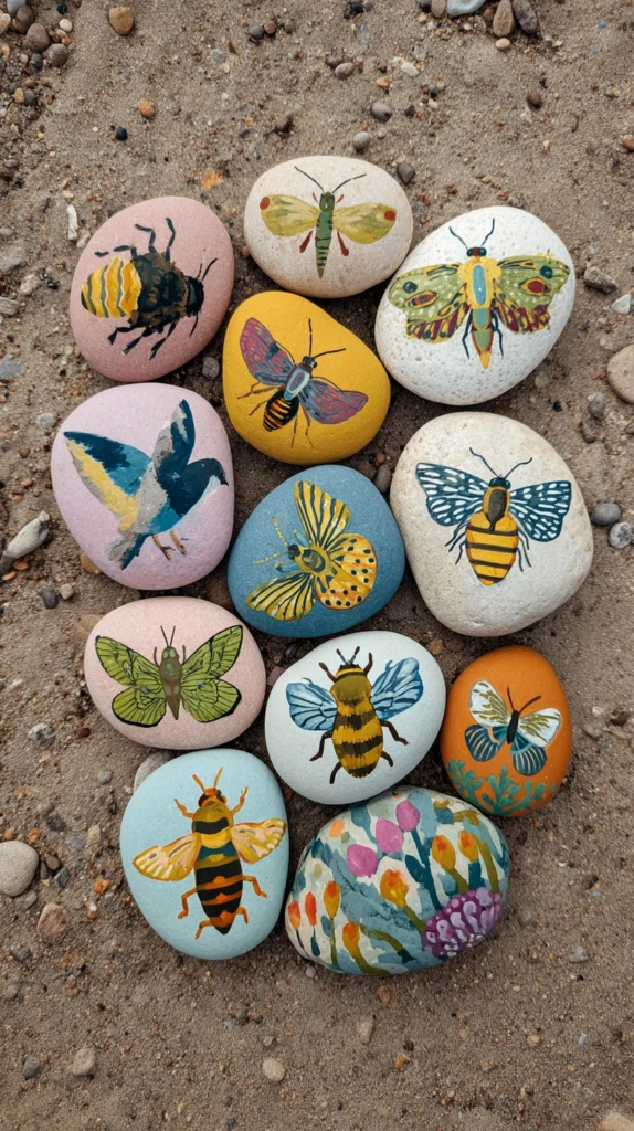 Paint realistic or stylized portraits of garden wildlife including birds, butterflies, bees, or other creatures celebrating the living beings that inhabit and visit outdoor spaces. Choose subjects commonly seen in your specific garden creating personal connections, paint realistically requiring careful observation and detail work, or stylize using simplified forms and bold colors creating folk art aesthetics. Position throughout gardens suggesting the creatures’ natural habitats—butterfly rocks near flowering plants, bird designs near feeders, bee rocks in pollinator gardens. The wildlife celebration demonstrates ecological awareness while adding personalized natural history illustration to landscapes.