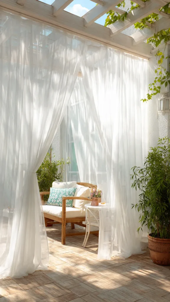 Sheer curtains also move gracefully in the breeze, adding a sense of motion and life to the space. They pair well with natural materials like wood, rattan, and linen cushions, creating a relaxed, coastal or bohemian look. Because sheer fabrics are usually affordable and easy to find, this idea is both budget-friendly and visually impactful.