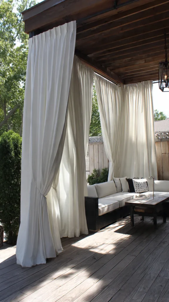 Sheer white curtains instantly give your patio a light, breezy, resort-like atmosphere. They filter sunlight gently rather than blocking it completely, creating a soft glow that makes the space feel calm and inviting. This style works beautifully for small patios, balconies, or pergolas where you want privacy without sacrificing brightness.