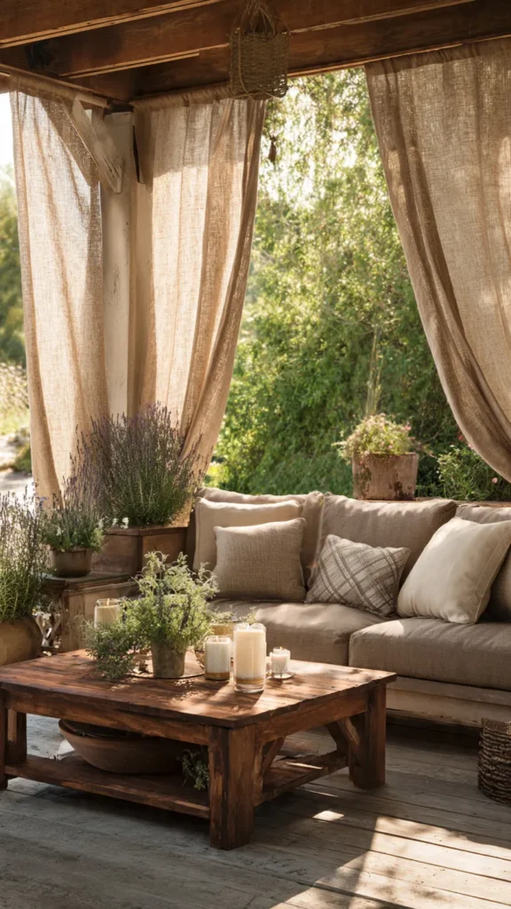 While true burlap may not be ideal for wet climates, many synthetic alternatives mimic the look while offering better durability. Paired with string lights and wooden furniture, this style creates a charming, relaxed outdoor retreat.