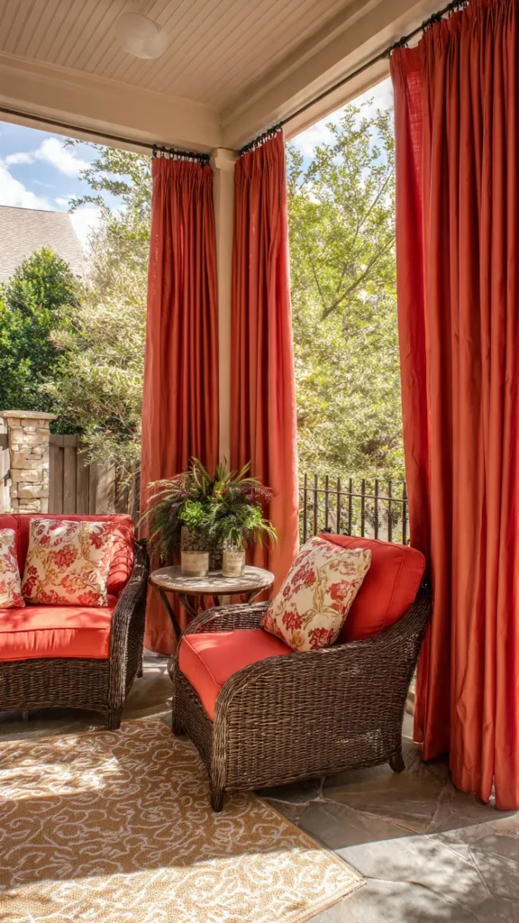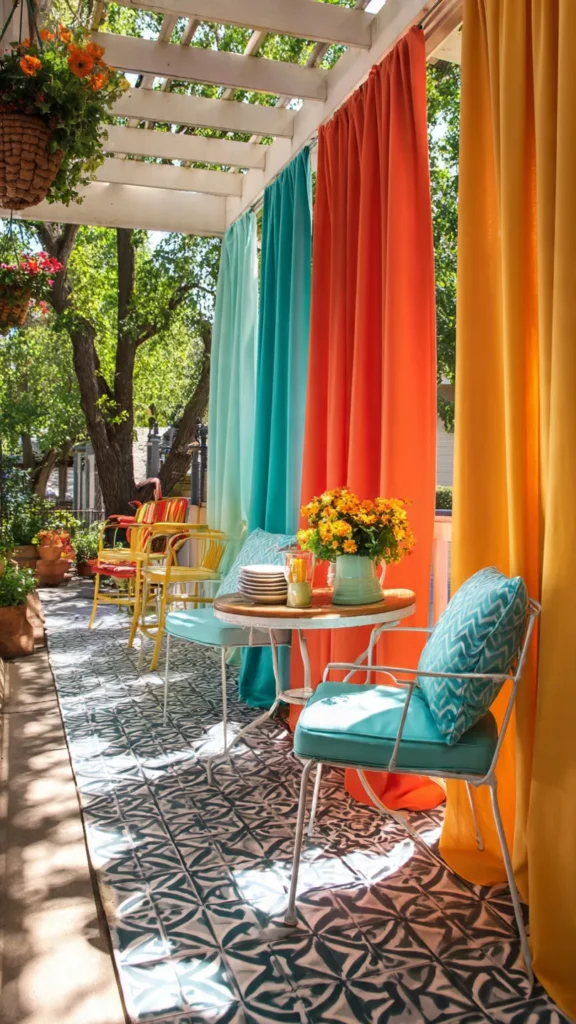 Brightly colored patio curtains can instantly lift the mood of your outdoor space. Shades like turquoise, coral, mustard, or teal add energy and playfulness, making the patio feel fun and vibrant.