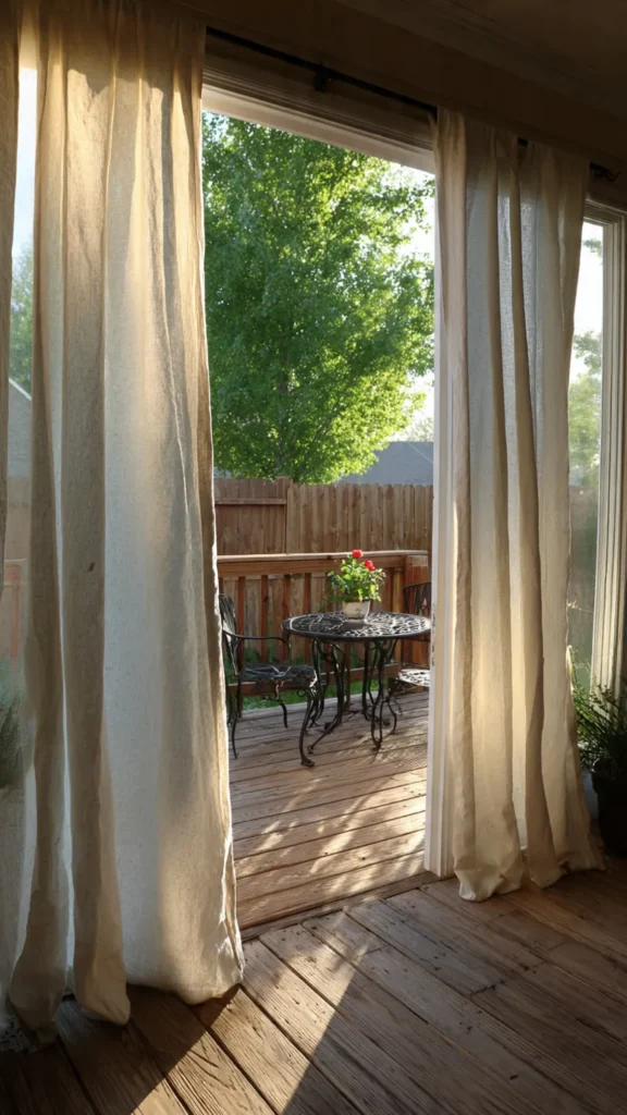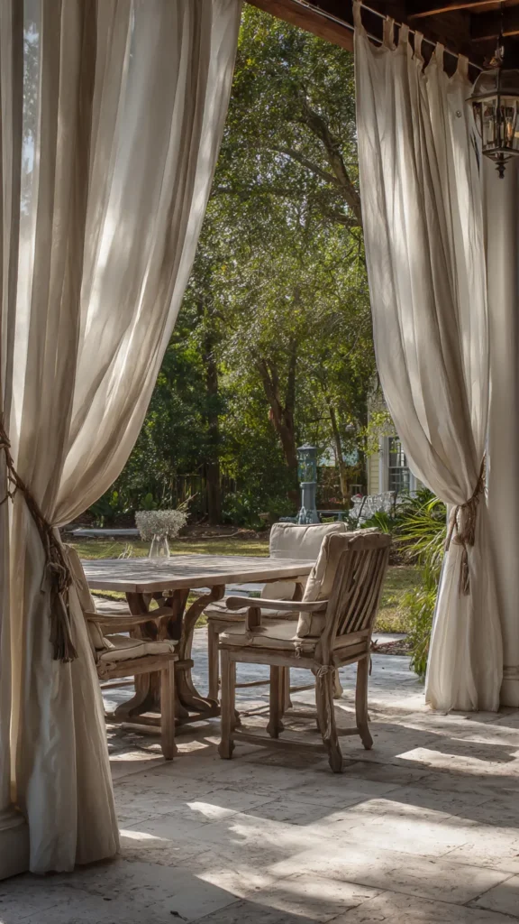 Curtains that can be tied back offer the best of both worlds: openness when you want it and privacy when you need it. With simple rope, ribbon, or fabric ties, you can control how much of your patio is enclosed at any time.