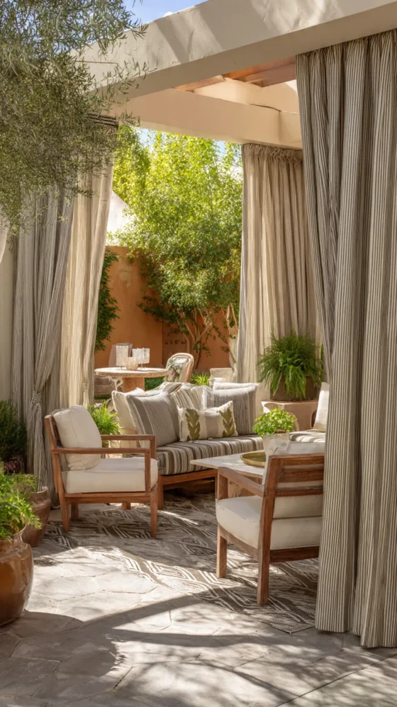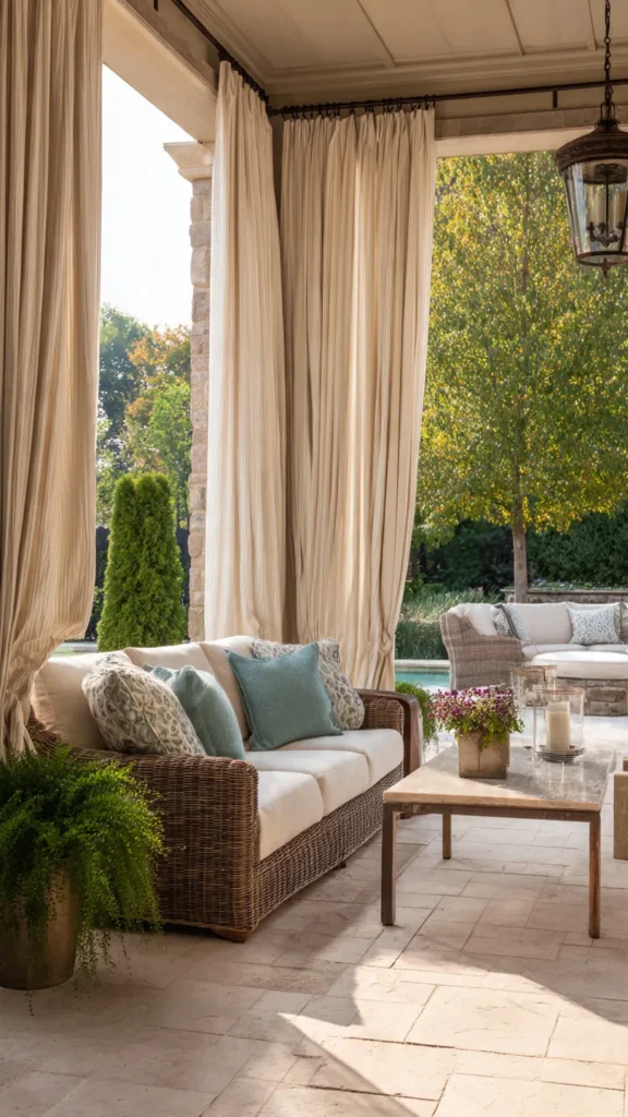 Long, floor-to-ceiling curtains give your patio a luxurious, hotel-like feel. They create a sense of height and elegance, even in modest outdoor spaces. When hung from a pergola, gazebo, or ceiling-mounted rod, they frame the patio beautifully.
