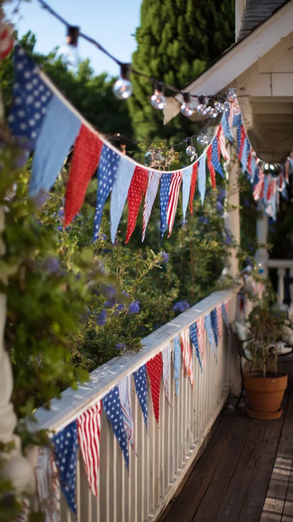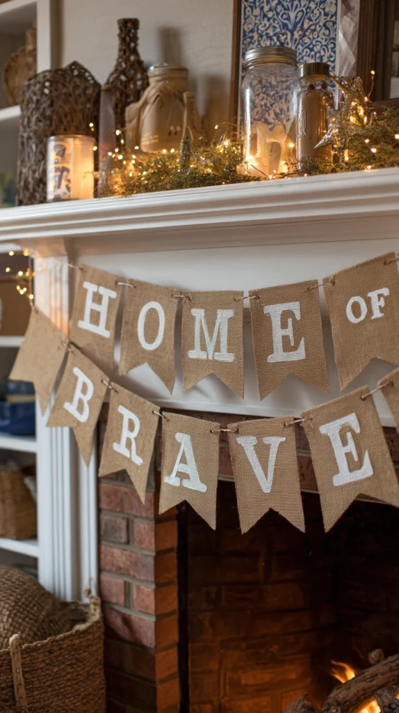 Hang fabric or burlap banners spelling out patriotic messages like “Land of the Free,” “Home of the Brave,” or “Remember and Honor” across mantels or outdoor spaces. Create DIY banners using triangular fabric pennants with letters stenciled or painted individually, strung on jute twine or ribbon.