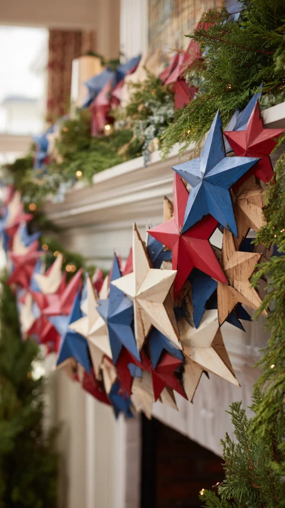 String together star garlands in various materials like wood, metal, fabric, or paper creating versatile decorations for mantels, staircases, or outdoor spaces. Purchase pre-made star garlands or create DIY versions by stringing wooden stars painted in alternating red, white, and blue on jute twine.