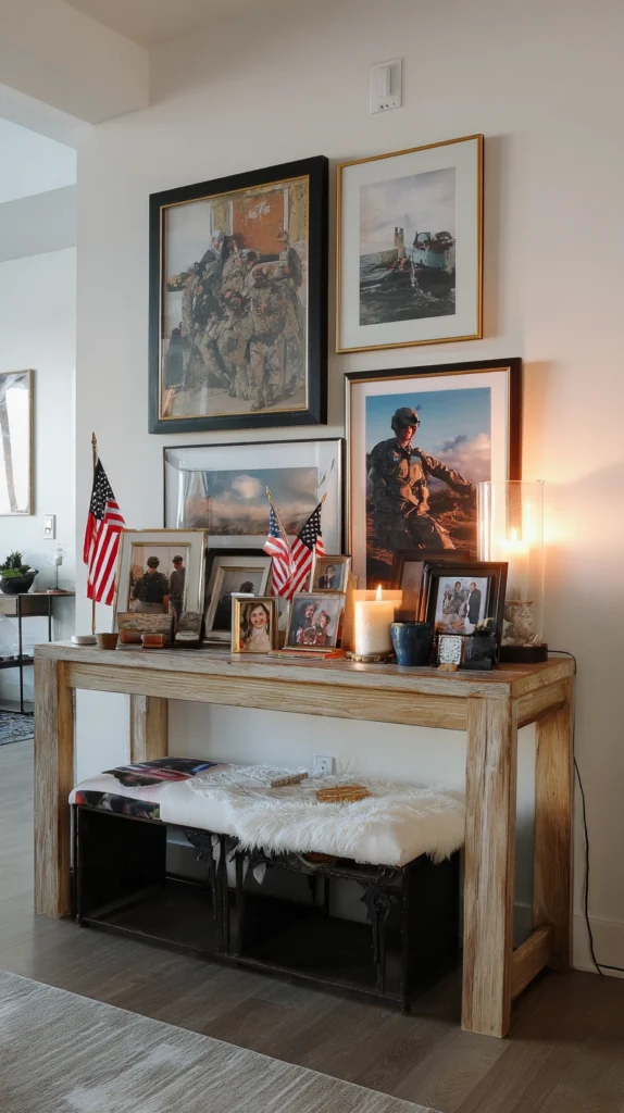 Create a respectful memorial corner honoring fallen service members through photographs of veterans, memorial candles, small flags, or remembrance ribbons acknowledging the holiday’s significance.
