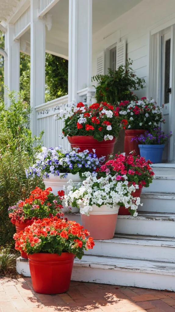 Transform plain terracotta or ceramic planters with patriotic paint designs creating coordinated containers for displaying red geraniums, white petunias, or blue lobelia. Paint pots in solid patriotic colors, create striped patterns, or add star stencils for more detailed designs that complement plantings.