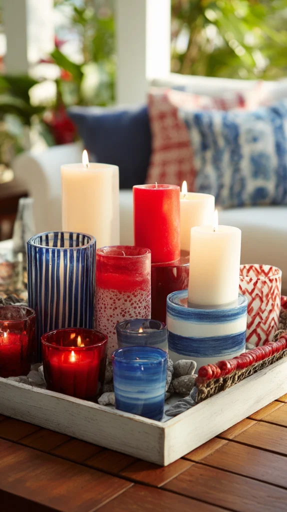Create ambient lighting through clustered candles in red, white, and blue holders or patriotic-themed containers positioned throughout indoor and outdoor spaces. Use pillar candles in varying heights grouped on trays or platters, votives scattered along tables, or lanterns holding larger candles creating layered illumination.