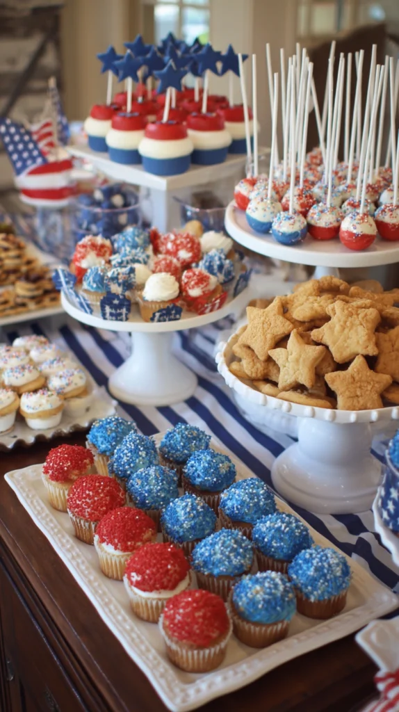 Design a patriotic dessert display featuring treats decorated in red, white, and blue arranged on coordinating serving pieces creating Instagram-worthy presentations. Bake or purchase cookies decorated with stars and stripes, cupcakes with patriotic toppers, and cakes frosted in flag designs or color blocks.