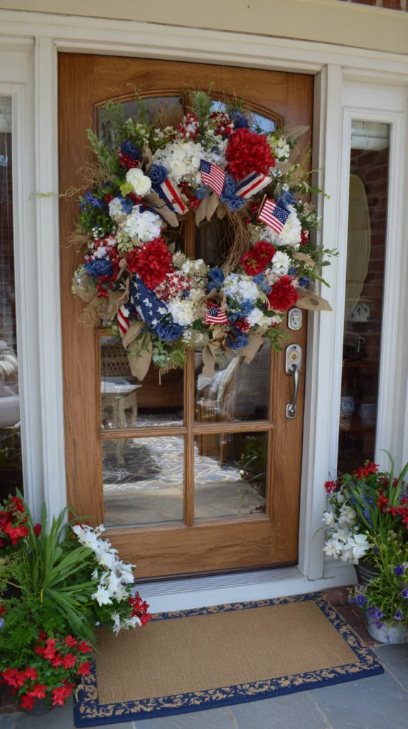 Greet guests with a patriotic wreath on the front door featuring red, white, and blue flowers, ribbons, miniature flags, or rustic Americana elements like burlap stars. Create DIY wreaths using grapevine or foam bases covered with painted wooden stars, silk flowers in patriotic colors, and wide ribbon bows.