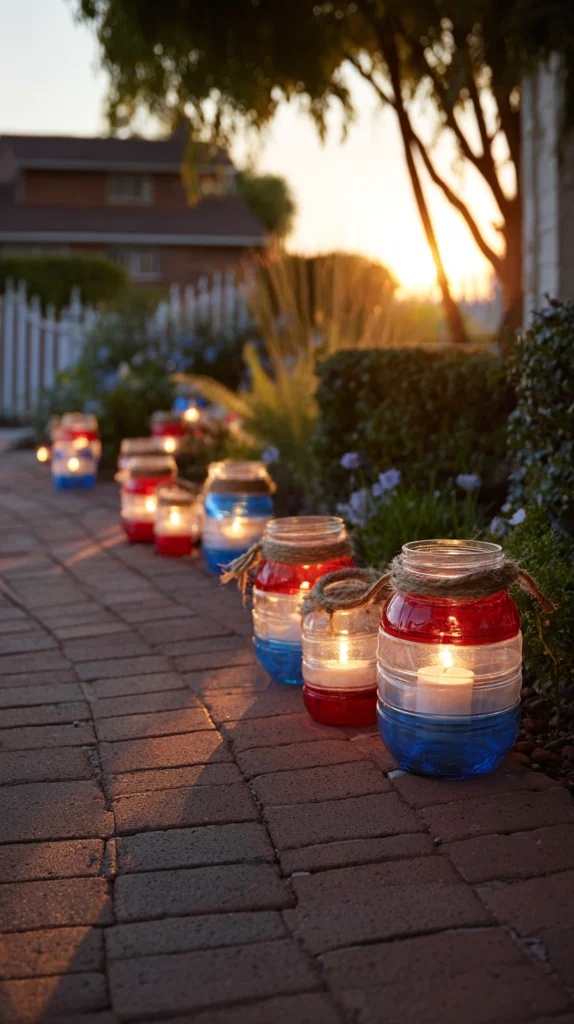 Fill painted jars with battery-operated tea lights, fresh flowers, or small flags creating glowing displays that line walkways or cluster on tables. Tie jute twine or coordinating ribbon around jar necks, perhaps adding small star charms or tags with patriotic messages or memorial acknowledgments.