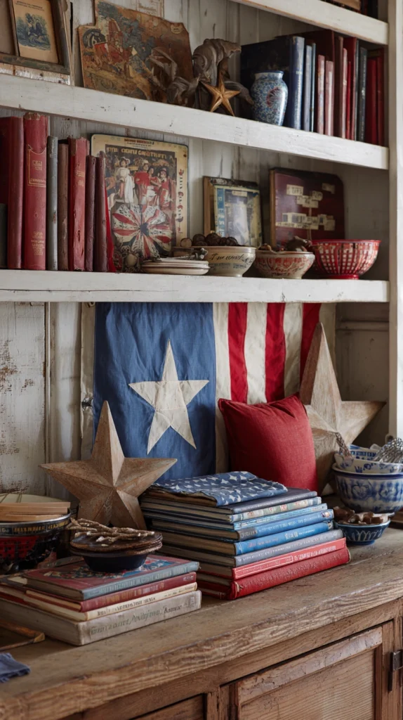 Display collections of vintage Americana items like antique flags, old books with patriotic covers, vintage postcards, or retro advertising featuring American themes. Arrange collections on open shelving, mantels, or console tables using books as risers and grouping items in odd numbers for visual appeal.