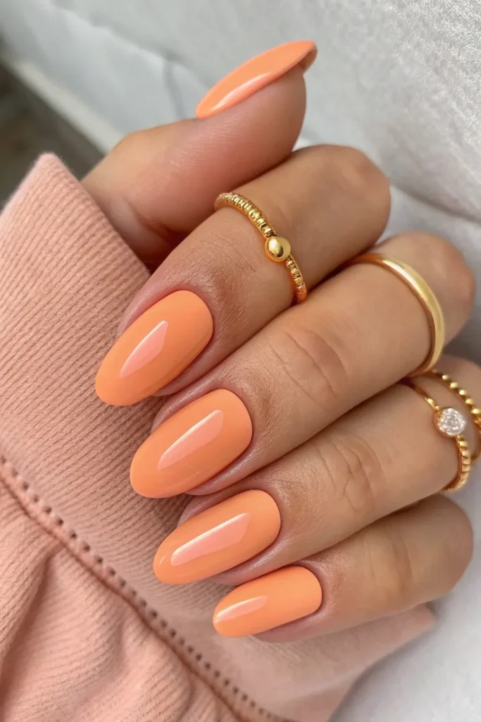 A glossy peach manicure is timeless, simple, and beautiful. The creamy shine gives your hands a fresh, polished look that suits any outfit.