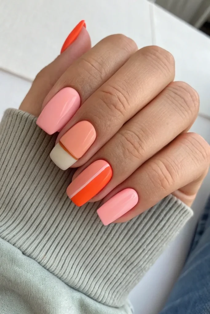 Paint one half of your nail peach and the other coral for a playful color-block effect. It’s unique, trendy, and surprisingly easy to pull off.