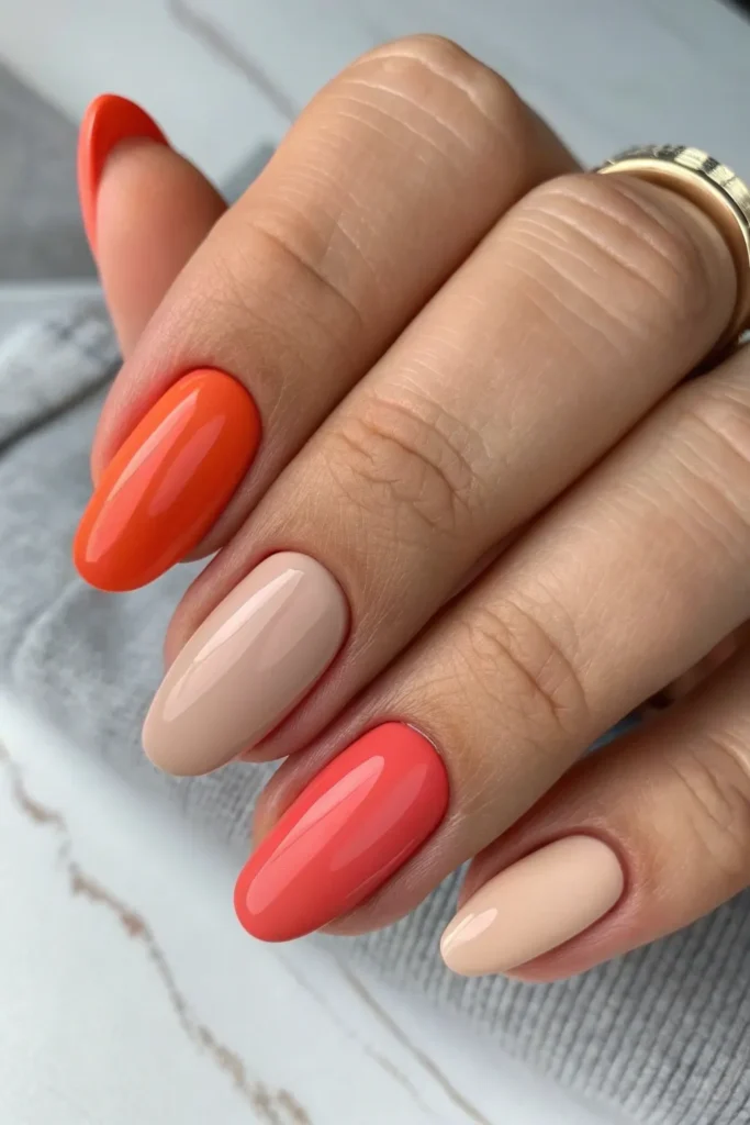 Mix coral polish with nude or beige tones for a stylish contrast that still feels elegant. It’s minimalistic yet fashionable.