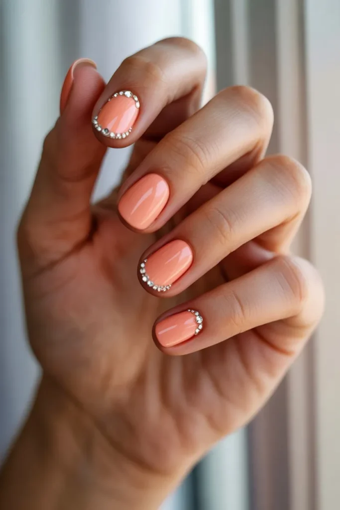 A few rhinestones on a glossy peach base add soft glamour without overpowering the design. It’s delicate and sophisticated.