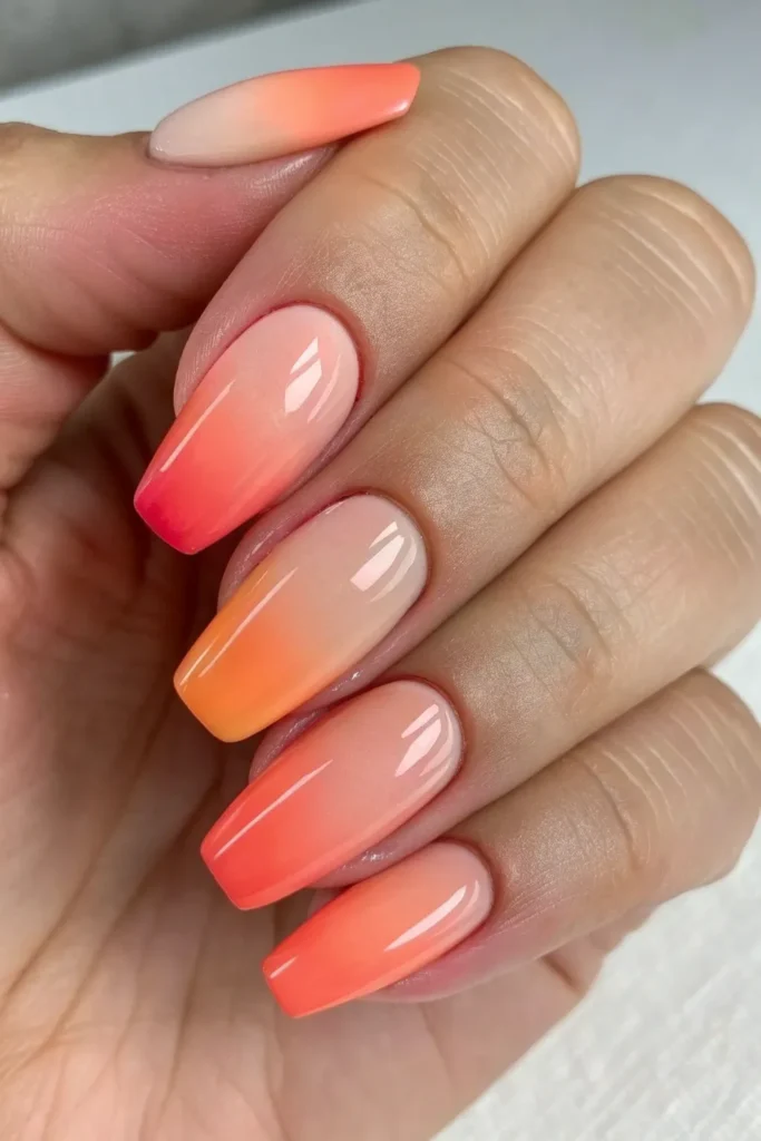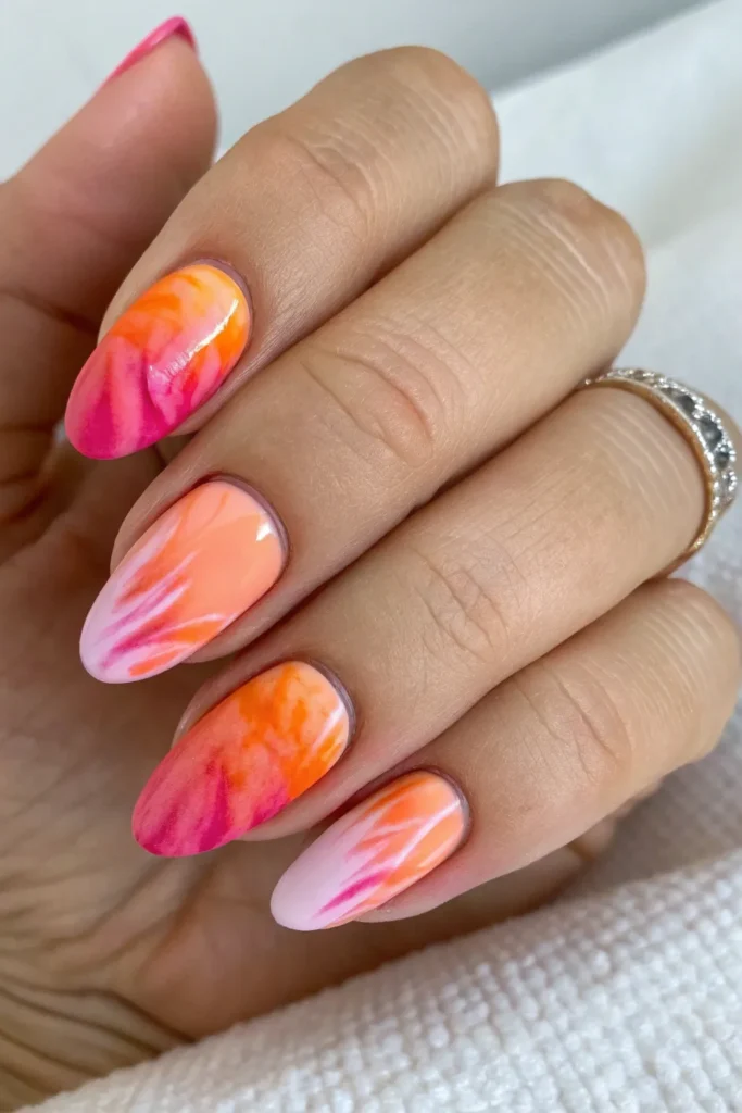 A watercolor blend of coral, pink, and orange gives a dreamy, artistic look. Each nail feels like a mini masterpiece.