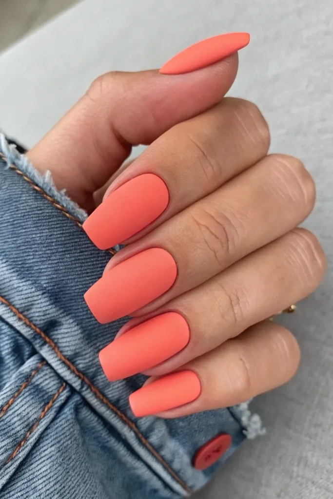 Matte coral nails give a bold yet elegant vibe. The texture adds a modern twist to the bright color, making it perfect for everyday glam.