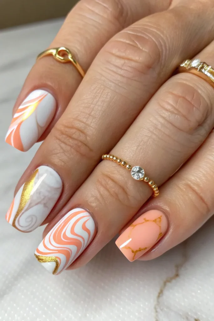 A marble effect mixing peach, white, and a hint of gold looks artistic and high-end. The soft swirls add texture and depth to the design.