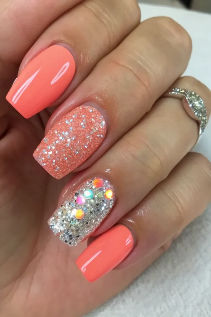 If you want a mix of sparkle and color, coral nails with glitter accents are ideal. You can add glitter to one or two nails for a balanced, fun design.