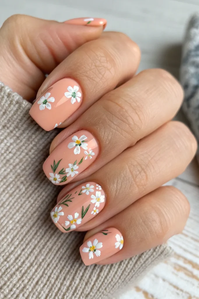 Soft peach nails decorated with tiny white flowers give a sweet, romantic look. It’s feminine and charming without feeling overdone.