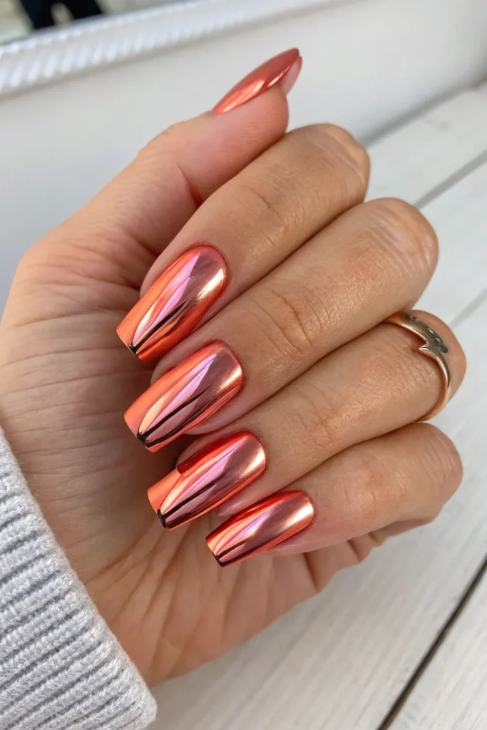 For a sleek, modern twist, try coral chrome nails with a metallic finish. They reflect light beautifully and add a bold statement to any look.