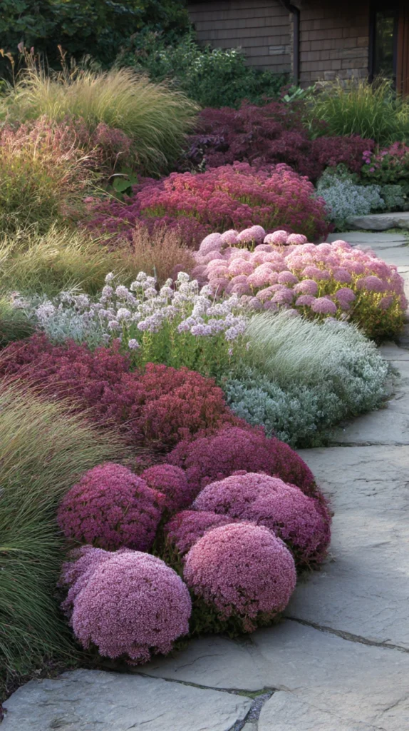 The taller sedums — particularly the varieties of Sedum spectabile and the Hylotelephium genus that have largely replaced them in modern planting — are the low maintenance perennial of late summer and autumn border structure, their flat, plate-like flower heads in warm tones of pink, dusty rose, and deep burgundy providing both a landing platform for late-season pollinators and the most architecturally distinctive seed head display of any herbaceous perennial available in the temperate garden.