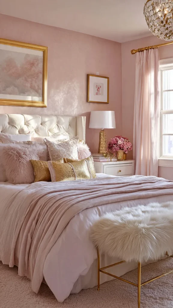 For a timeless and adaptable bedroom, balance pink and gold with neutral foundations like white, beige, or soft gray. Using pink in accents and gold in decor ensures the room feels elegant rather than overly themed. This approach allows the design to evolve over time.