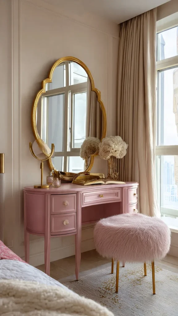 A pink vanity corner can be both functional and decorative. A soft pink table paired with a gold-framed mirror creates a glamorous yet practical setup for daily routines. This feature is especially popular in teen bedrooms but can be styled more minimally for adults.