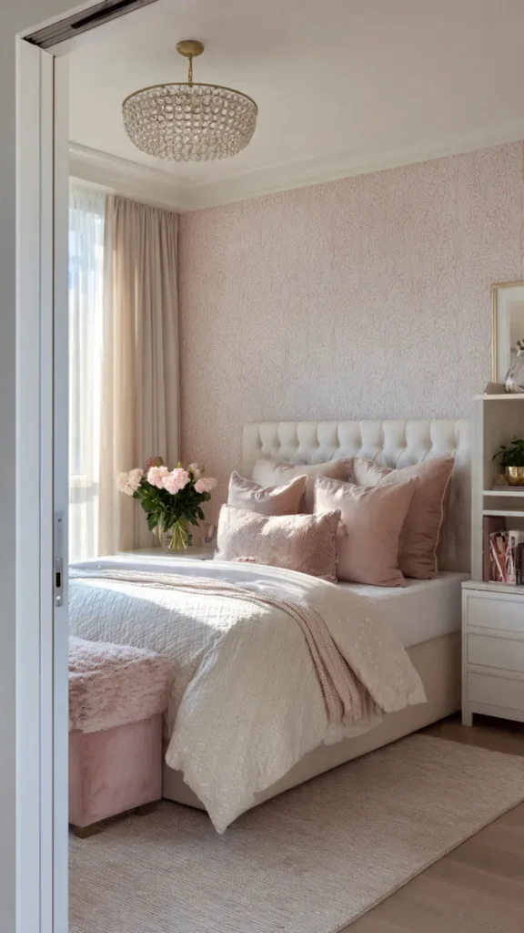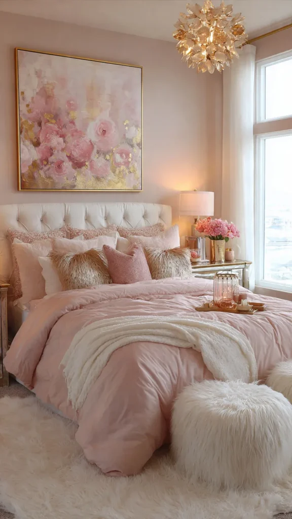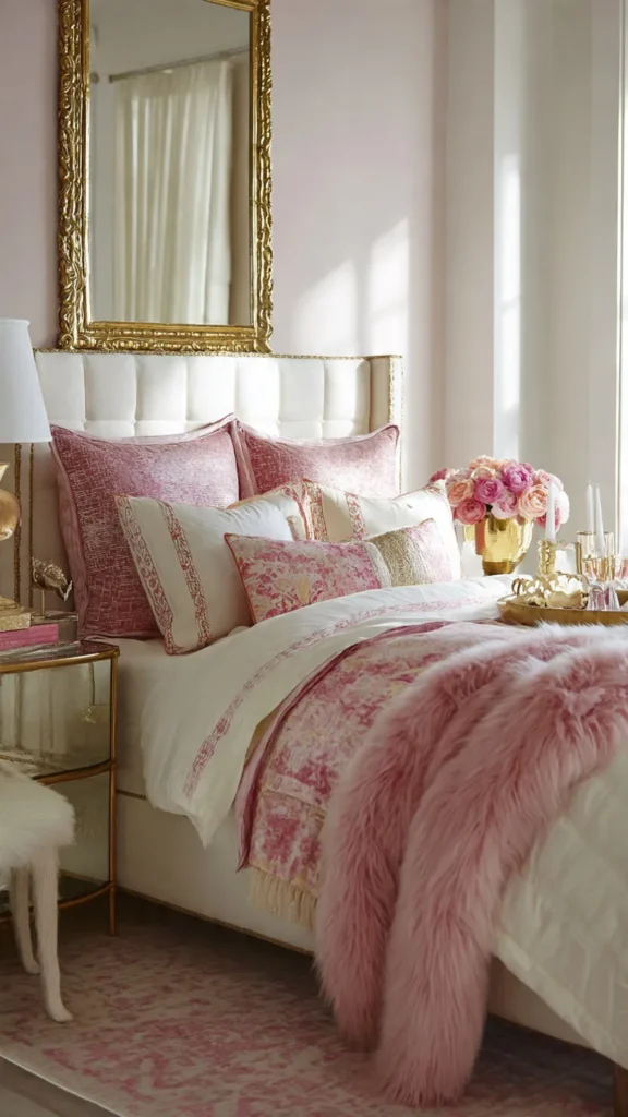 Layering textiles is essential for creating a cozy and visually rich bedroom. Mixing various pink tones through pillows, throws, and blankets adds warmth and depth. Gold accents in embroidery, trims, or decorative cushions enhance the overall design.