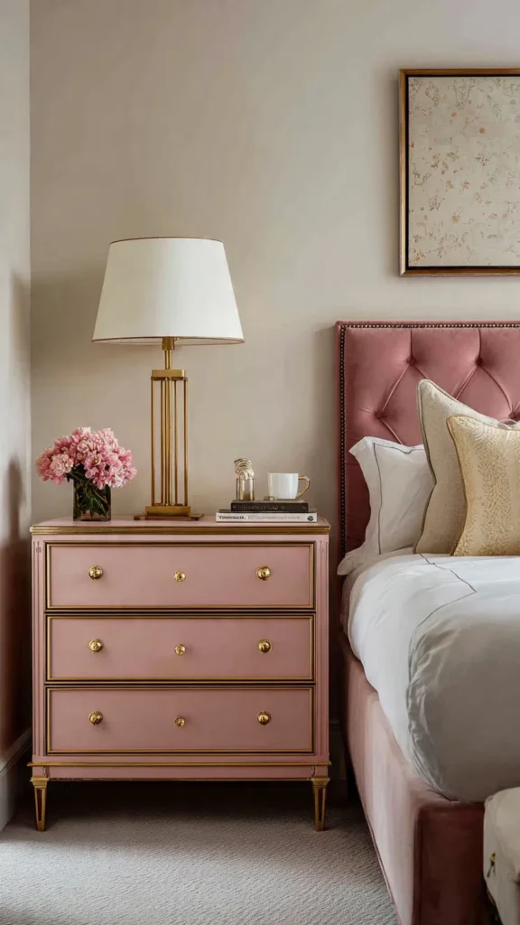 Pink furniture pieces such as dressers, nightstands, or benches can add personality and charm. Choosing designs with gold hardware instantly elevates the look, making the furniture feel custom and high-end. This idea works best in rooms with neutral walls.