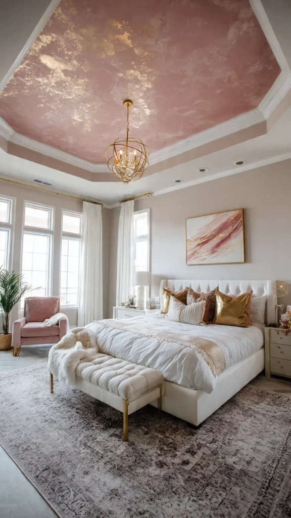 A blush pink ceiling offers a unique and unexpected design choice that adds warmth without overwhelming the walls. Pairing it with gold light fixtures or ceiling details draws attention upward and creates a cozy, enveloping feel. This works particularly well in rooms with higher ceilings.