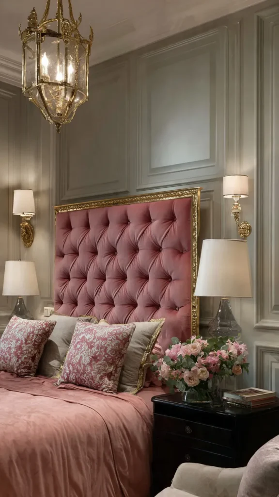 This idea works especially well in bedrooms with neutral walls, as the pink headboard becomes the main statement. Gold accents elsewhere in the room, such as bedside lamps or drawer handles, help create a cohesive and polished look.