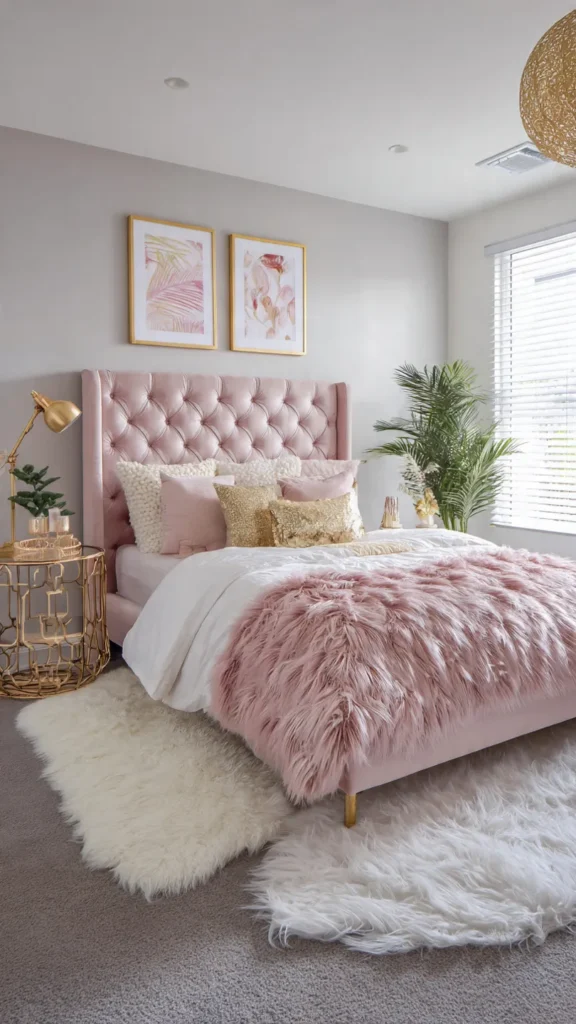 Rugs are especially useful for teens, as they are easy to change as styles evolve. For adults, a plush or patterned rug can enhance comfort while maintaining a cohesive pink and gold theme.