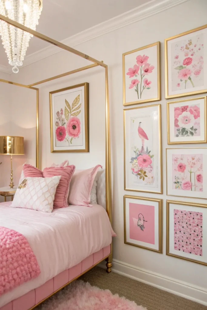 Artwork is an easy way to personalize a pink and gold bedroom. Pink-toned illustrations, abstract designs, or floral prints framed in gold add elegance and character to the walls. This idea allows teens to express creativity while giving adults a gallery-style aesthetic.