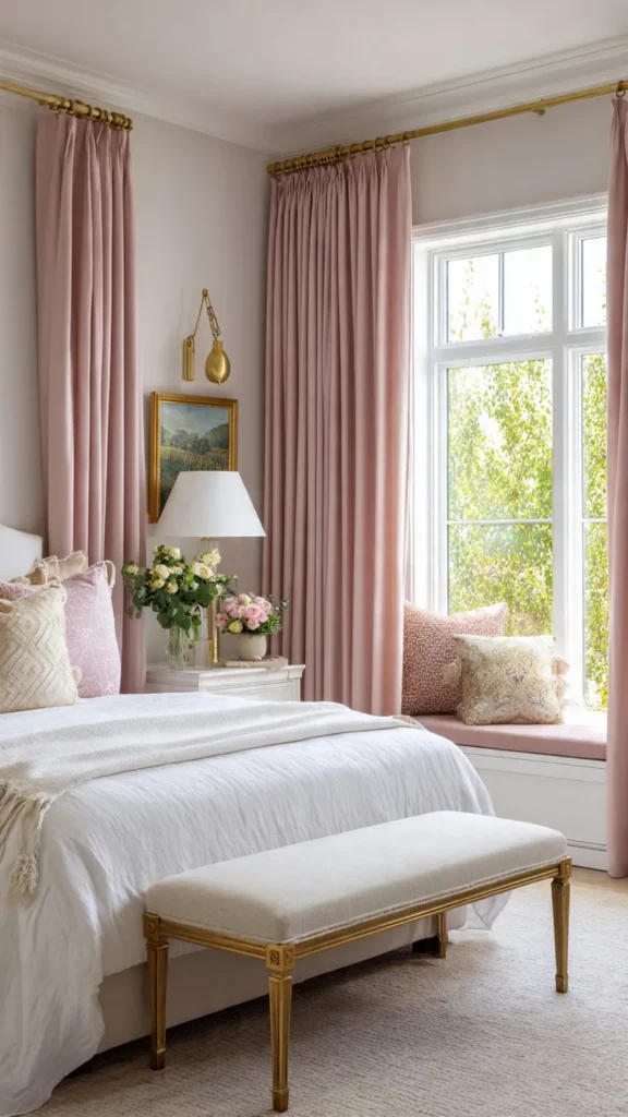 Window treatments can dramatically impact the overall look of a bedroom. Dusty pink curtains soften natural light and add warmth, while gold curtain rods and finials introduce a refined touch. This pairing frames windows beautifully and enhances the room’s vertical space.