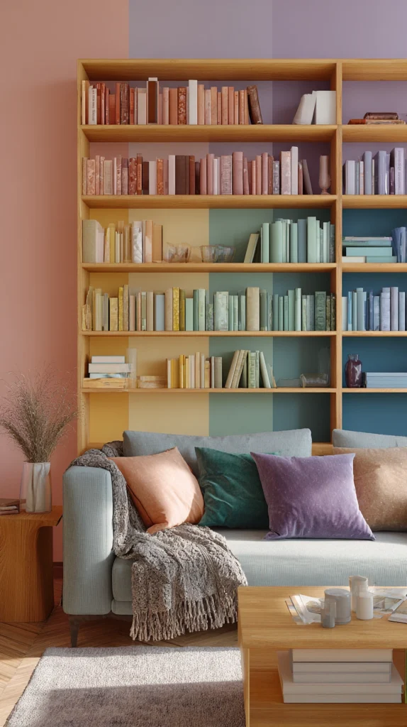 Dusty rose into terracotta into amber into sage into slate into lavender. Not primary red into primary orange into primary yellow. The tonal rainbow bookshelf is the version that works in every room and with every existing palette — and it works because it is a rainbow that has been edited by someone with genuine colour knowledge and genuine decorative confidence.