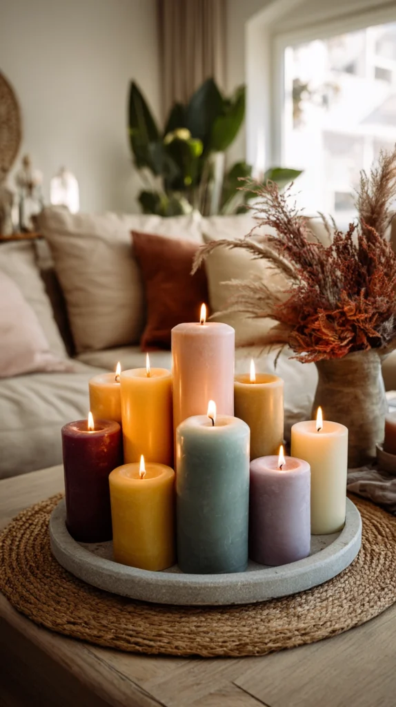 Choose candles in muted, sophisticated versions of each spectrum colour — dusty rose, warm amber, sage green, soft teal, muted lavender — rather than primary or fluorescent shades, group them in a cluster of varying heights, and light them together for an arrangement that glows with a warmth and a colour richness that only candlelight, in its specific and irreplaceable way, can produce.