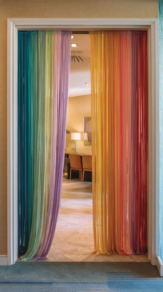 A doorway or window dressed with a rainbow ribbon curtain — lengths of quality grosgrain or satin ribbon in a full spectrum of muted, sophisticated colours, hung vertically from a slim timber or metal rod at the top of the opening and allowed to fall freely to the floor — creates a rainbow architectural intervention of extraordinary lightness, extraordinary movement, and extraordinary decorative originality.
